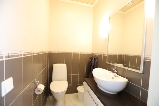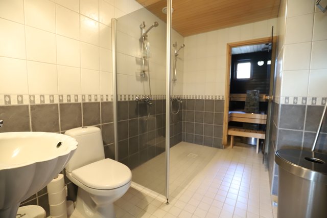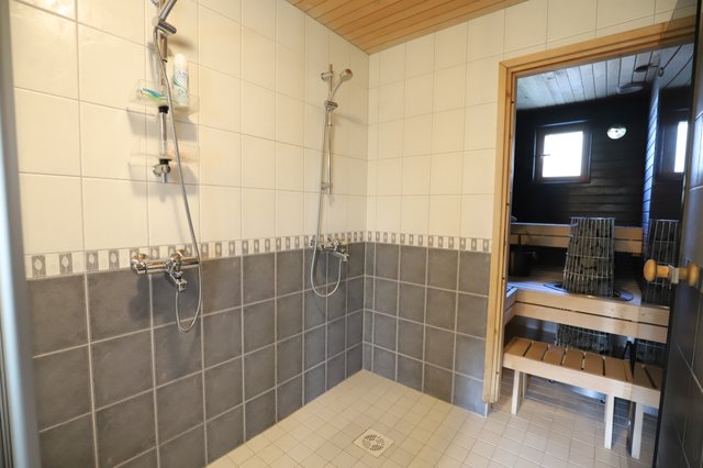 - WC-istuin, suihku, suihkuseinä, lattialämmitys, peilikaappi, ja pesuallas