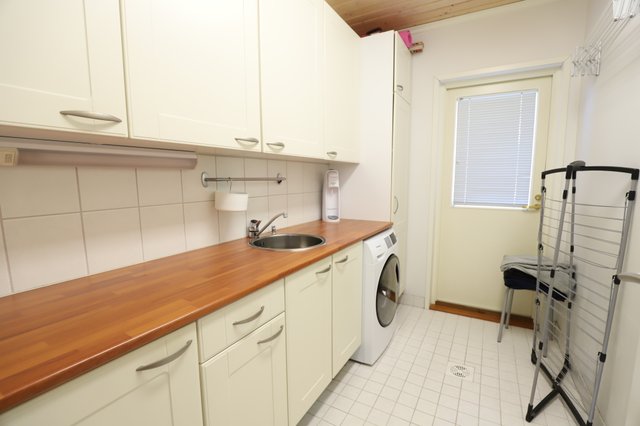 - Pesukoneliitäntä, lattialämmitys, pesuallas, pyykkikaapit, ja pöytätaso