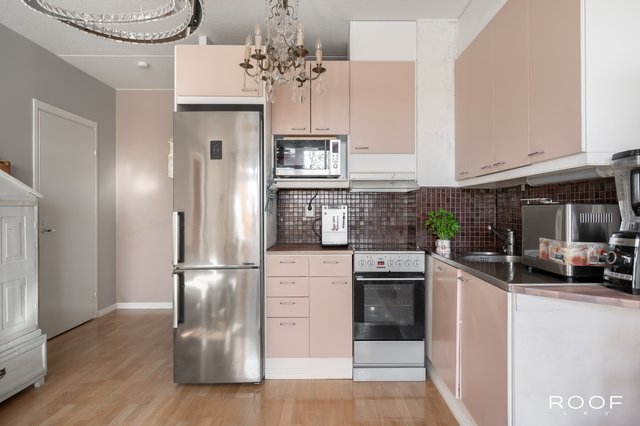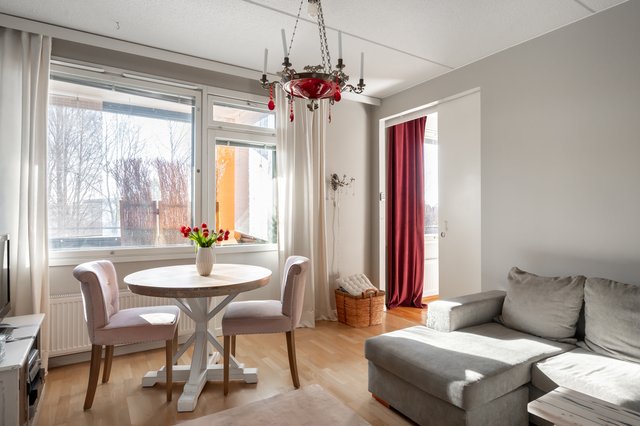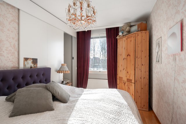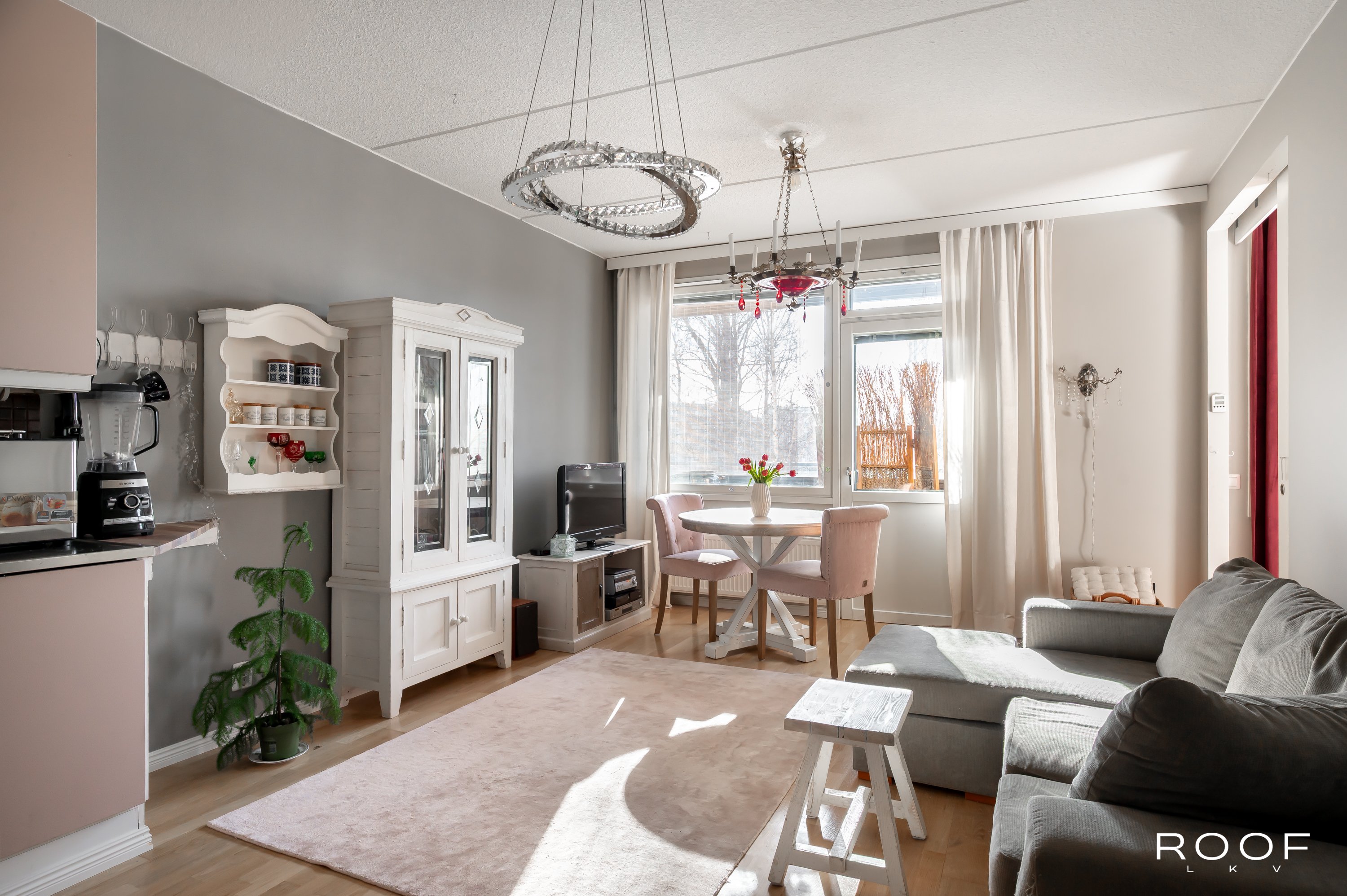Avokeittiö on kodin sydän. Tilava makuuhuone, jossa hyvin kaappitilaa ja paikka etätyöpisteelle. Tilaavaan kylpyhuoneeseen mahtuu vaikka pesutorni.
