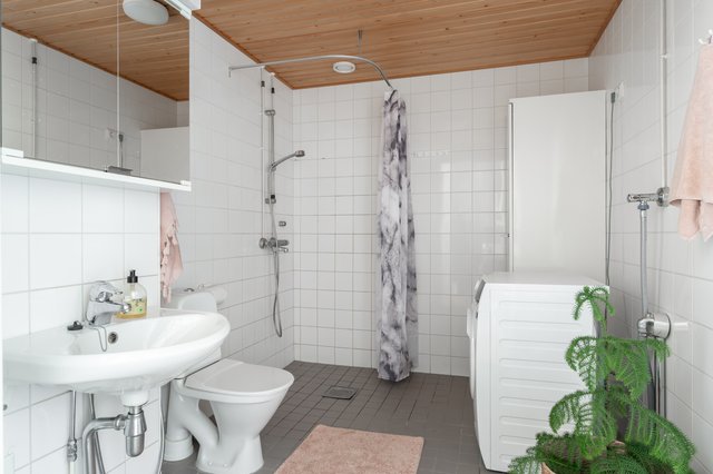- VARUSTUS: Suihku Wc istuin Pesukoneliitäntä Hana Allas Peilikaappi SEINÄT: Laatta LATTIA: Laatta