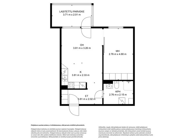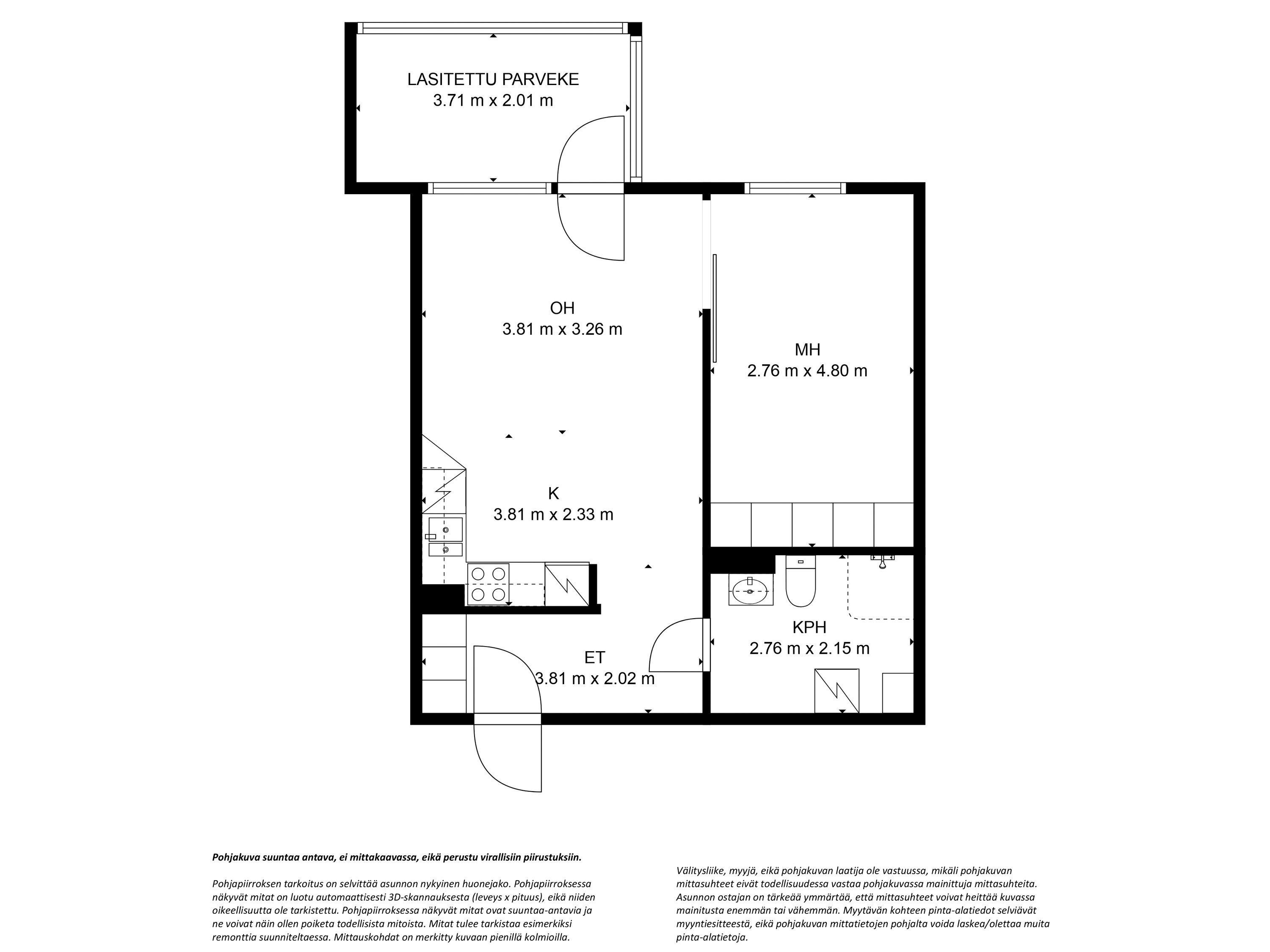 - Yhtiöjärjestyksen mukainen, Isännöitsijäntodistuksen mukainen, (Pinta-ala ei ole tarkistusmitattu ja todellinen pinta-ala voi olla suurempi tai pienempi, kuin ilmoitettu)