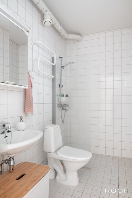 - WC-istuin, suihku, suihkuseinä, peilikaappi, ja lattialämmitys
