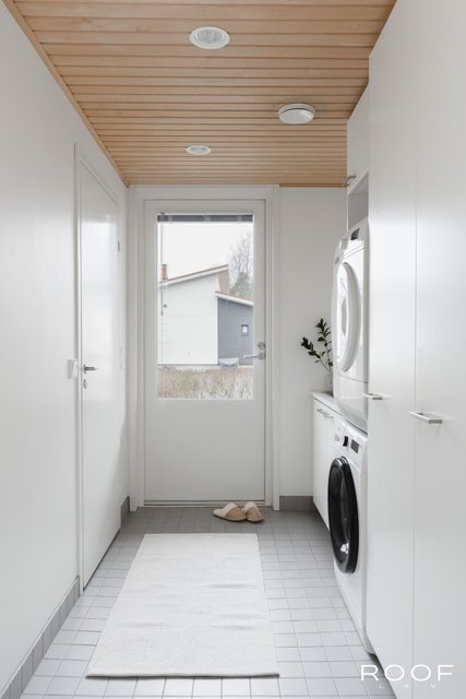 - Pesukoneliitäntä, lattialämmitys, lattiakaivo, pesuallas, pöytätaso, ja tila pesutornille