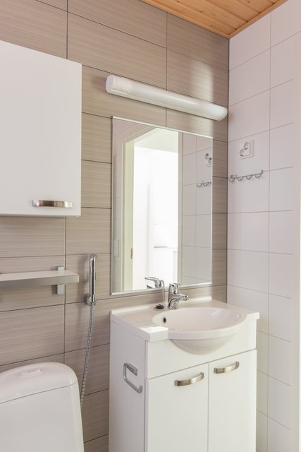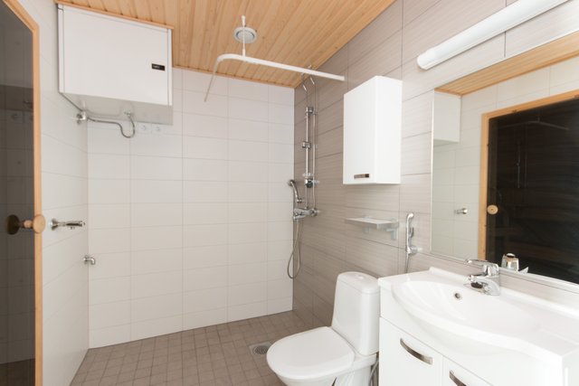 - WC-istuin, suihku, pesukoneliitäntä, peilikaappi, allaskaappi, bidee-suihku, suihkuseinä, ja lattialämmitys