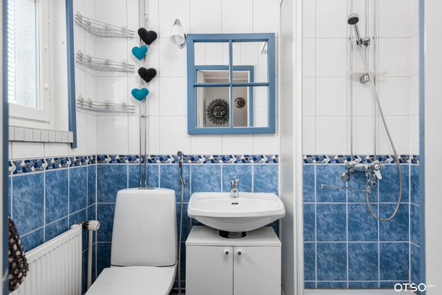 - WC-istuin, suihku, suihkukaappi, lattialämmitys, peili, pesuallas, allaskaappi, ja bidee-suihku