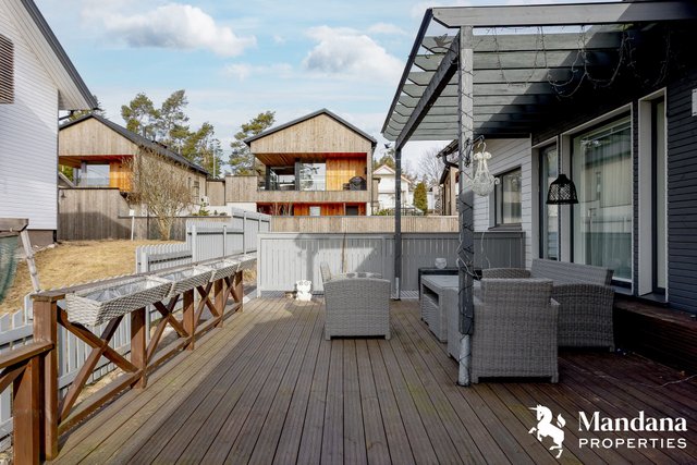 Tilava terassi tarjoaa viihtyisän paikan ulkoilmasta nauttimiseen. Lisäksi asunnolle kuuluu kaksi sähköpistokkeellista autopaikkaa, joissa on myös sähköauton latausmahdollisuus.
