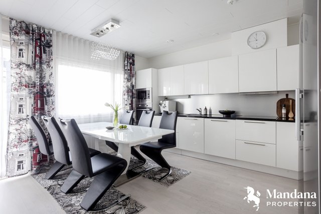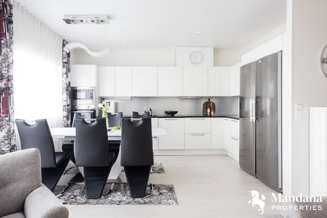 - Laadukas Puustellin keittiö on varustettu kivitasoilla ja moderneilla kodinkoneilla.