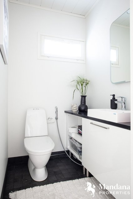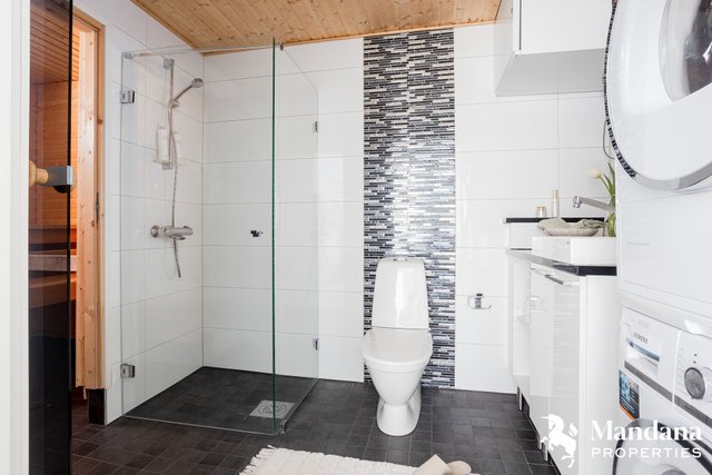 - WC-istuin, suihku, lattialämmitys, suihkuseinä, pesukoneliitäntä, peili, allaskaappi, pesuallas, pesukone, ja kuivausrumpu