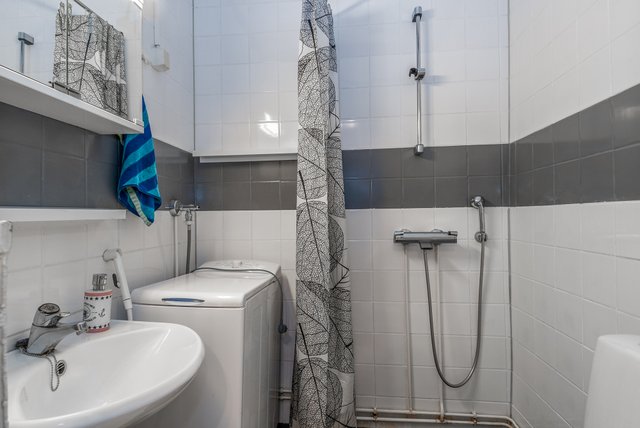 - Suihku, peilikaappi, pesukoneliitäntä, bidee-suihku, ja pesukone