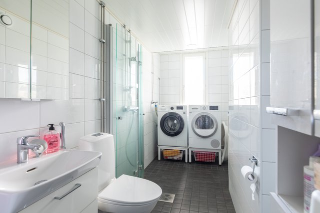 - Suihku, suihkuseinä, pesukoneliitäntä, wc-istuin, lattialämmitys, peilikaappi, allaskaappi, ja bidee-suihku
