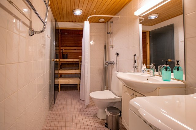 - WC-istuin, suihku, pesukoneliitäntä, lattialämmitys, peili, ja pesuallas