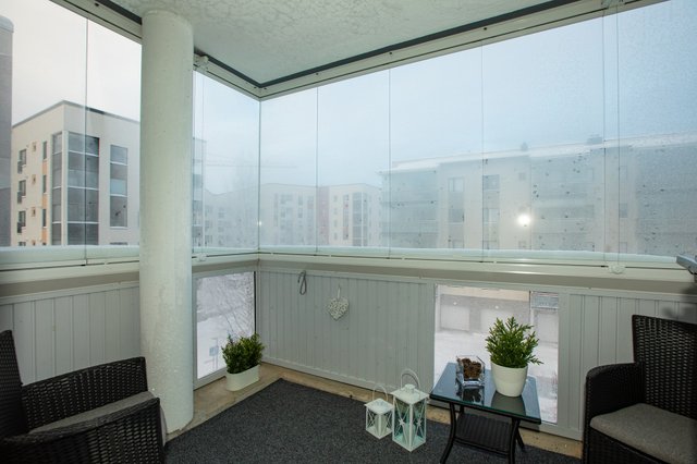Asunnossa on oma sauna ja lasitettu parveke, jotka tuovat mukavuutta arkeen. Parveke on erinomainen paikka nauttia rauhallisista hetkistä ja ihailla ympäröivää maisemaa. Keittiössä on kaikki tarpeellinen, kuten jääkaappipakastin ja sähköuuni, ja koko asunnossa on kaunis parkettilattia.