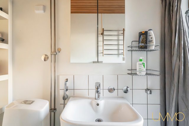 - WC-istuin, suihku, pesukoneliitäntä, bidee-suihku, peilikaappi, pesuallas, ja allaskaappi