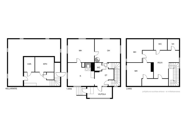 - Ajantasaisia pohjakuvia eikä tietoa loppukatselmuksen suorittamisesta ole saatavilla rakennuksen iän takia. Pinta-alatiedot ovat suuntaa-antavia eikä niitä ole tarkistusmitattu. Kokonaisalaksi on merkitty verotietoihin 152 m2 asuinrakennuksen osalta. Kellaritilat ja osa yläkerrasta on normaalia huonekorkeutta matalampaa tilaa. Pinta-alat saattavat tämän ikäisissä kohteissa (rekisteröity ennen 01.01.1992) poiketa olennaisestikin asuinrakennusten nykyisten mittaustapojen ja standardien (SFS 5139) mukaan laskettavasta asuintilojen pinta-alasta. Pinta-ala voi siis olla edellä mainittua pienempi tai suurempi.