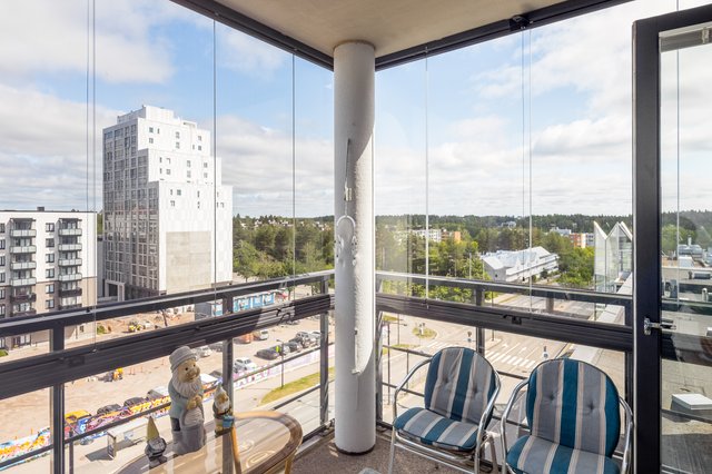 Kattohuoneisto upein näkymin! Valoisa olohuone, tilavat makuuhuoneet eri laidoilla, oma sauna ja lasitettu parveke – täydellinen koti rauhalliseen ja mukavaan arkeen Myyrmäen sydämessä.