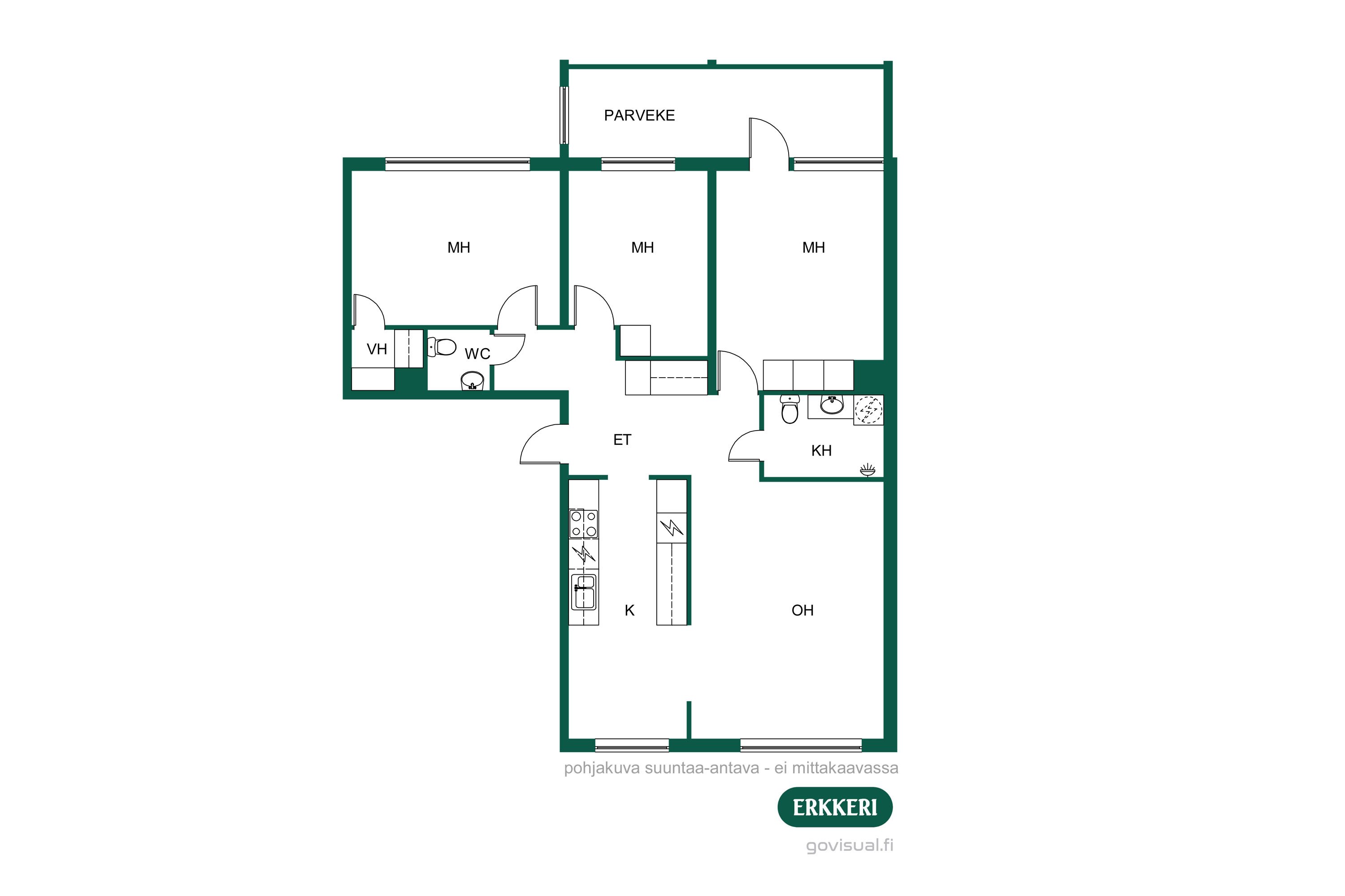 - Ikkunat kolmeen suuntaan. Avarat pihanäkymät.
