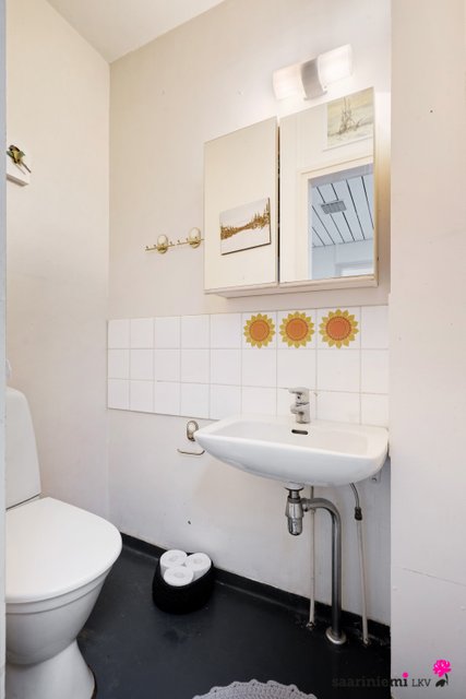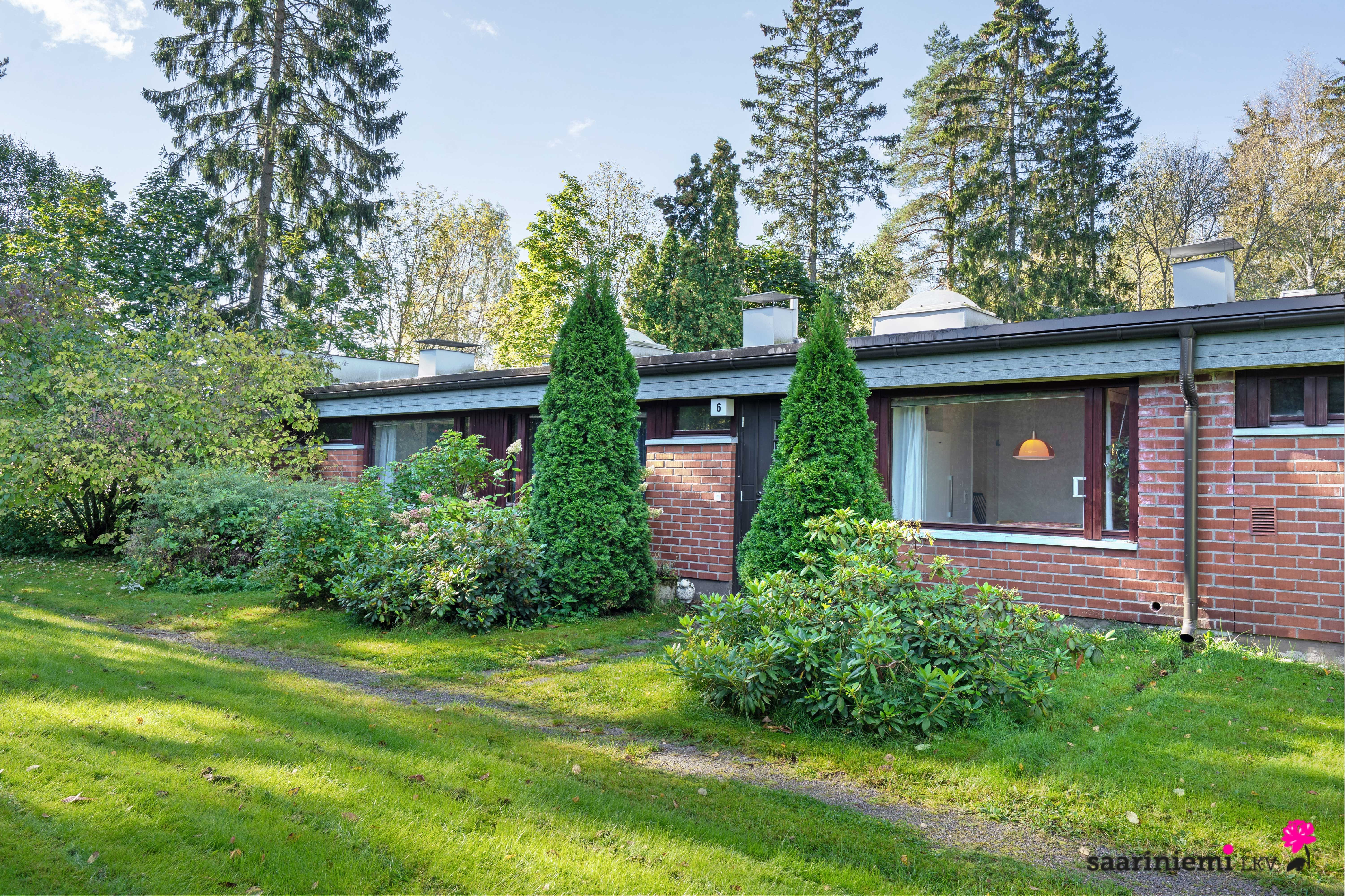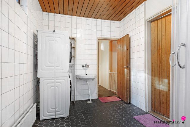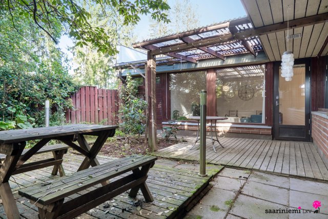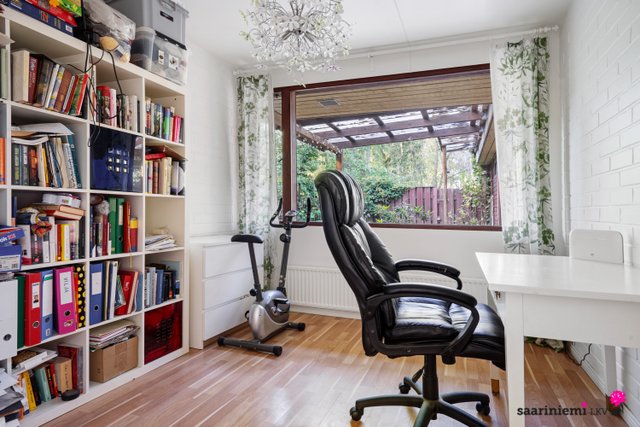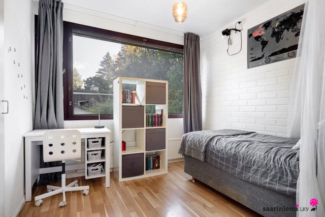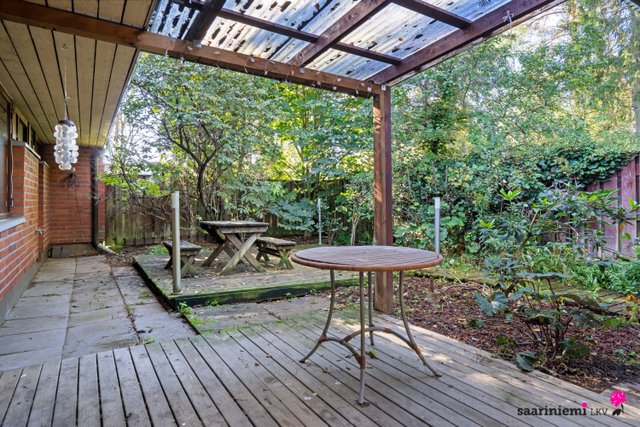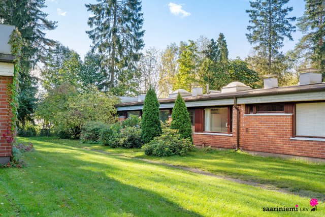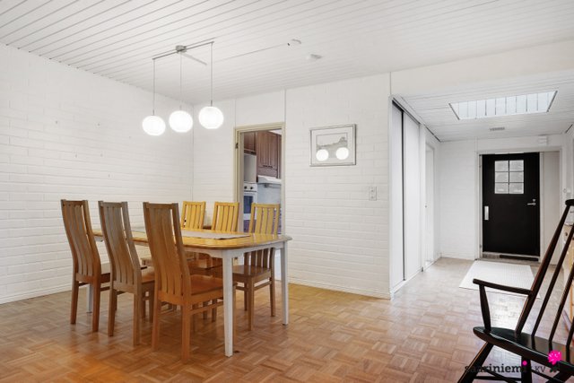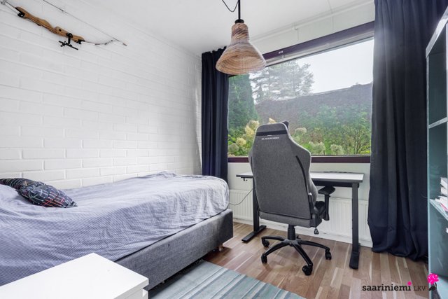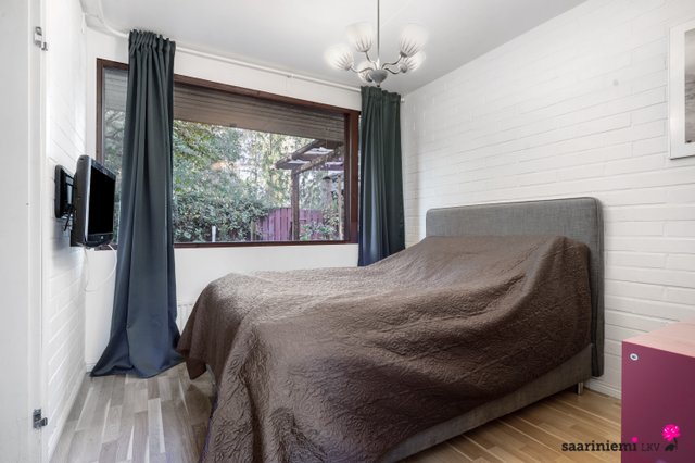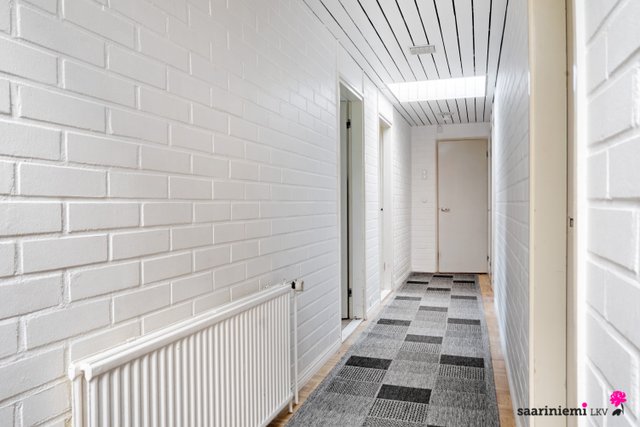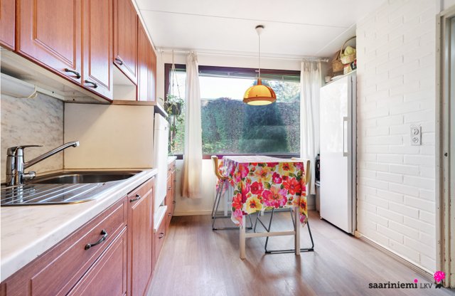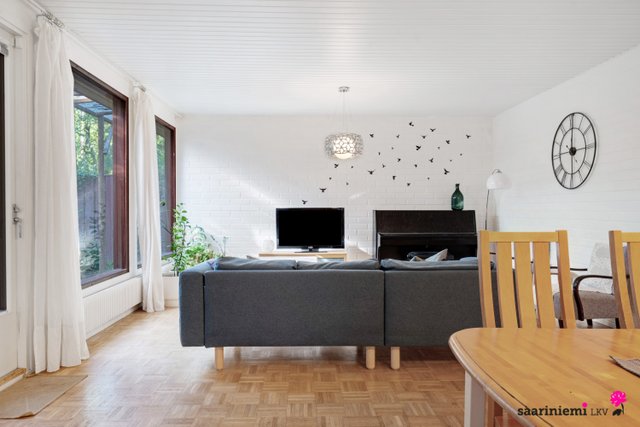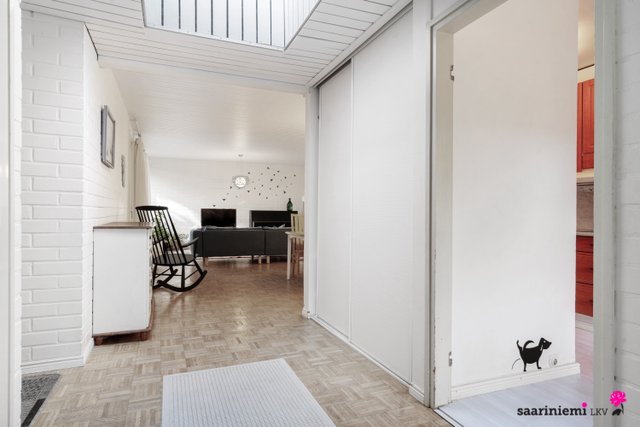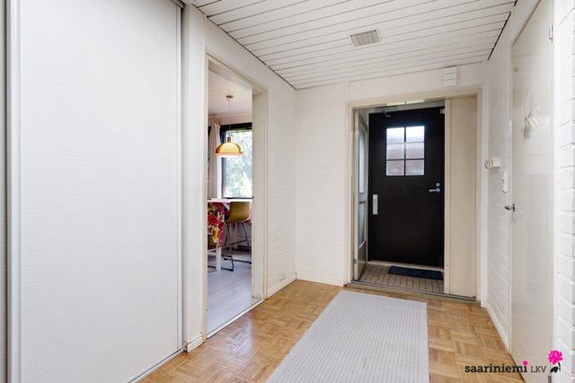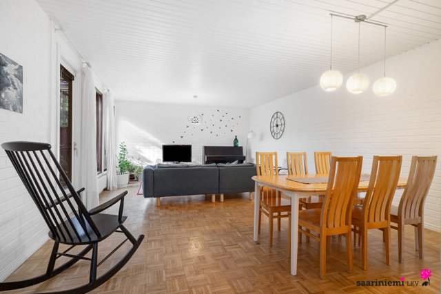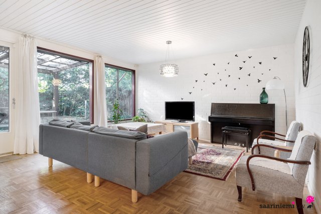 Tässä neljän makuuhuoneen kodissa on ihanaa 1970-luvun tunnelmaa. Olohuoneen isot ikkunat tuovat valon lisäksi vehreän pihamaiseman osaksi rauhallista sisustusta. Asunnon valkoiset tiiliseinät ovat ajattomia, valoisia ja sopivat yhteen erilaisten sisustustyylien kanssa. Asunnossa on oma sauna, jonka lempeistä löylyistä pääset helposti suojaisalle ja aidatulle pihalle vilvoittelemaan. Kodin kaksi wc:tä tuovat kiireettömyyttä perheen arkiaamuihin.