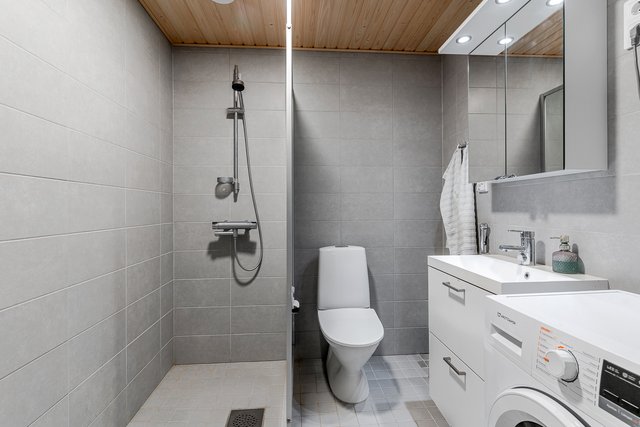 - WC-istuin, suihku, suihkuseinä, pesukoneliitäntä, lattialämmitys, peilikaappi, allaskaappi, ja bidee-suihku