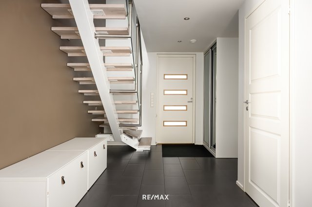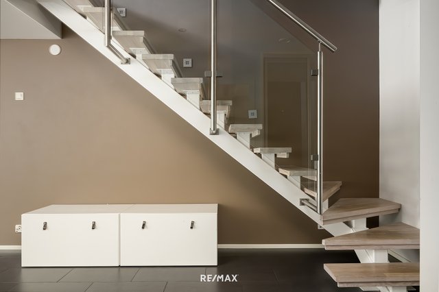 - Tilava eteinen alakerrassa, jonka lattia laattaa, ja seinät maalattu, liuuovikaapisto. Yläkerran aulatila / toinen olohuone, lattia laminaattia ja seinät maalattu.