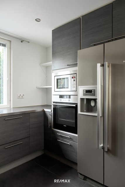 - Tilavassa keittiössä runsaasti kaapisto- ja laatikostotilaa, isot työtasot laminaattia, induktioliesi, erillisuuni, integroitu astianpesukone, mikroaaltouuni, liesituuletin.