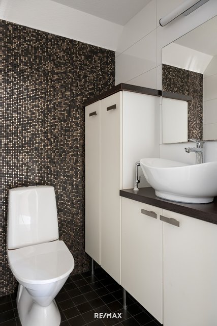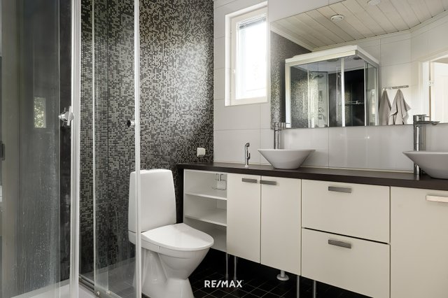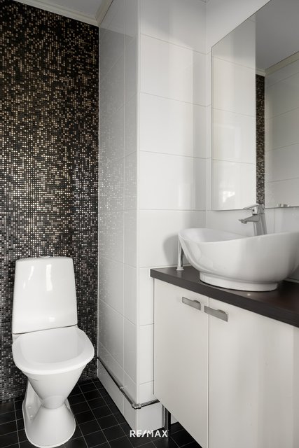 - Alakerran kylpyhuoneessa lattia ja seinät laattaa, suihku. Yläkerran kylpyhuoneessa lattia ja seinät laattaa, suihkukaappi, kaksi allasta, allastaso, kaapisto, peili, wc-istuin.