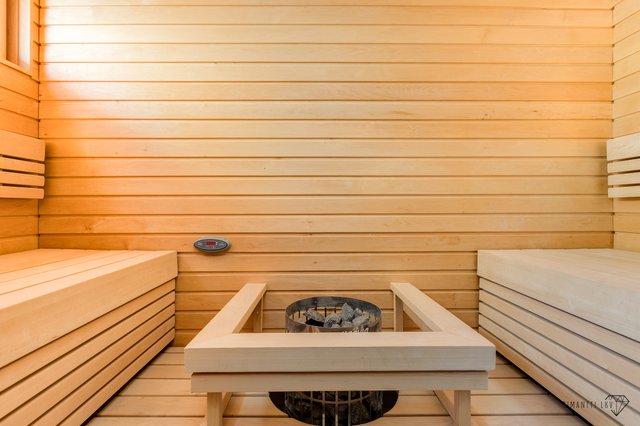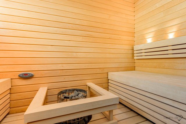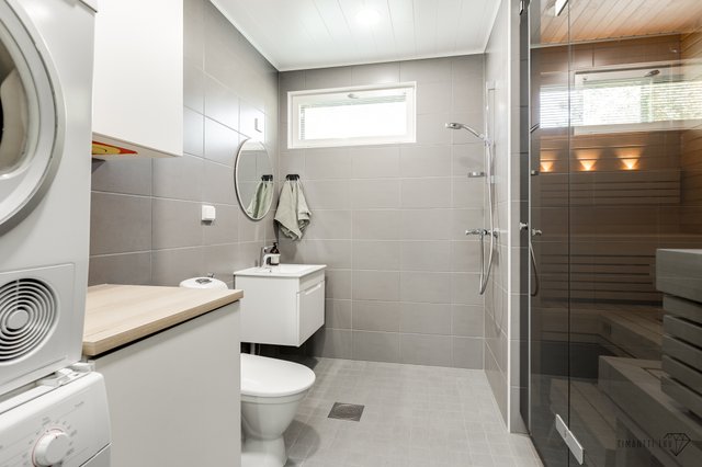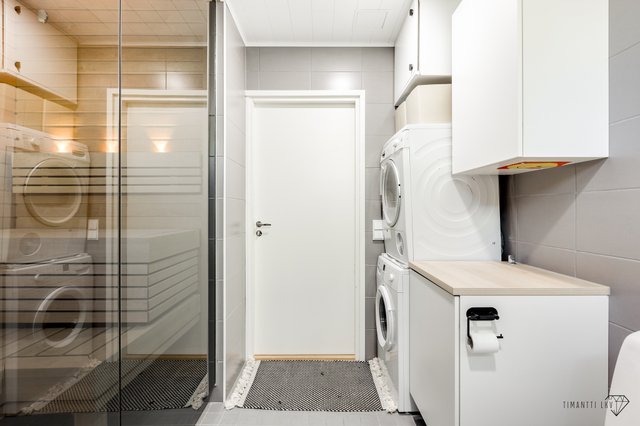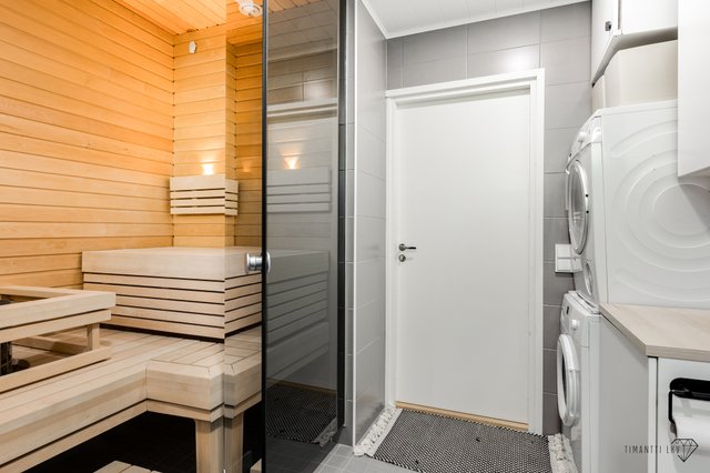 Oma sauna tarjoaa rentouttavat löylyt tyylikkäällä lasiseinällä ja sähkökiukaalla. Kylpyhuoneen yhteydessä on kodinhoitotila pyykkihuollolle.