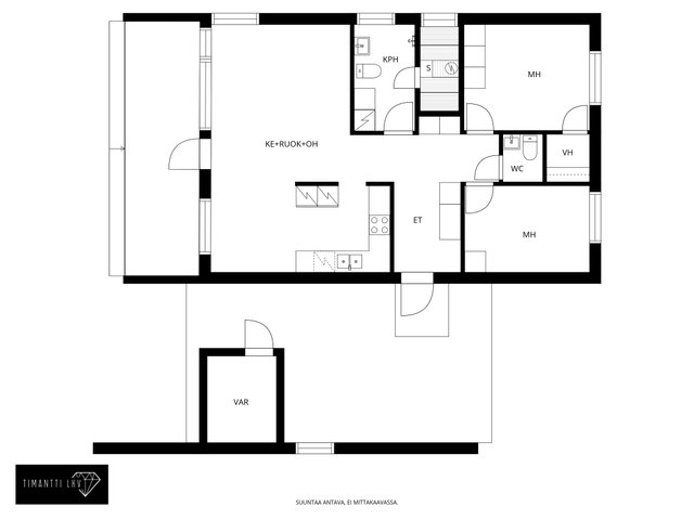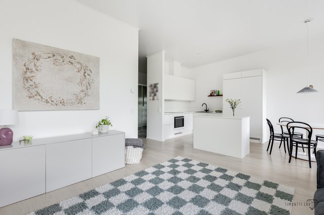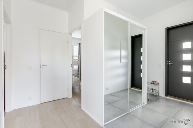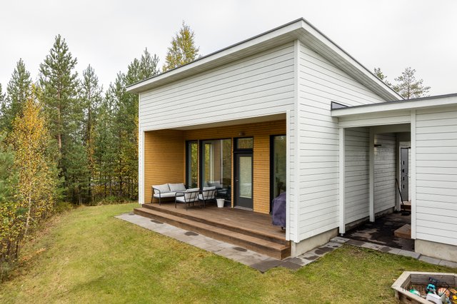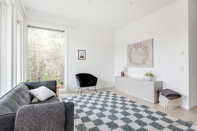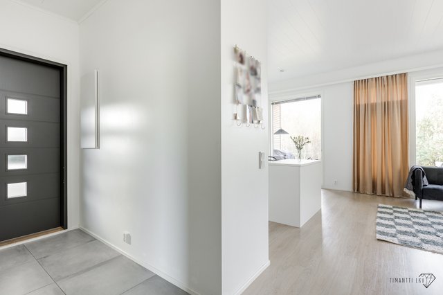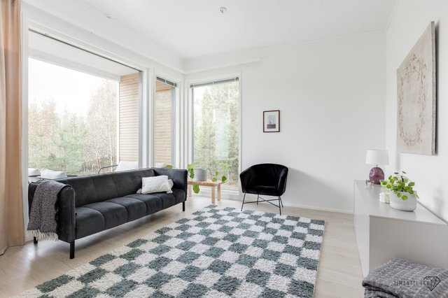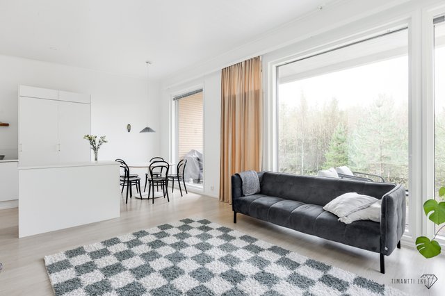 Kodin valoisat tilat on yhdessä tasossa. Suuret ikkunat ja korotettu katto tuovat mukavuutta asumiseen ja pohjaratkaisu on suunniteltu toimivaksi.