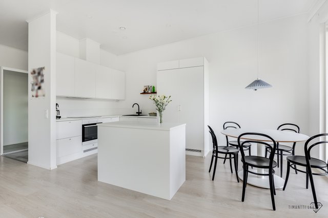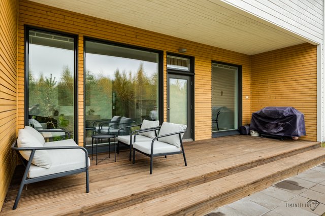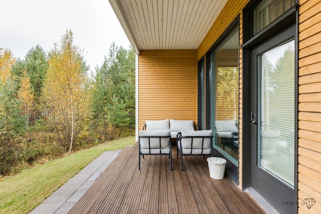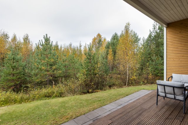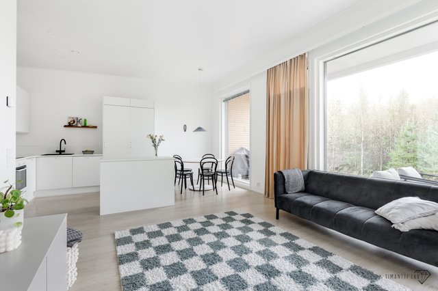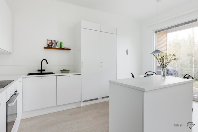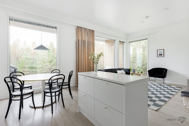 Keittiö on varustettu laadukkailla kalusteilla integroiduilla kodinkoneilla ja lisää tilaa tuo erillinen saarake. Olohuoneesta on käynti tilavalle terassille, josta avautuu miellyttävä metsäinen näkymä.