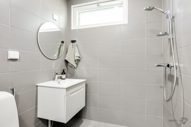 - WC-istuin, suihku, pesukoneliitäntä, lattialämmitys, peili, pesuallas, allaskaappi, ja bidee-suihku