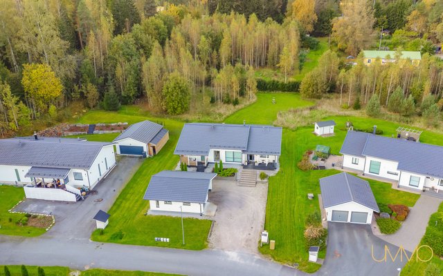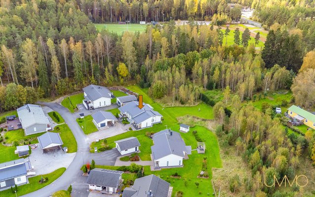 Talo sijaitsee päättyvän tien varrella, joten läpikulkuliikenne ei häiritse. Moottoritielle on nopea ja helppo yhteys, joten työmatkat Turkuun tai Helsinkiin sujuvat vaivattomasti.