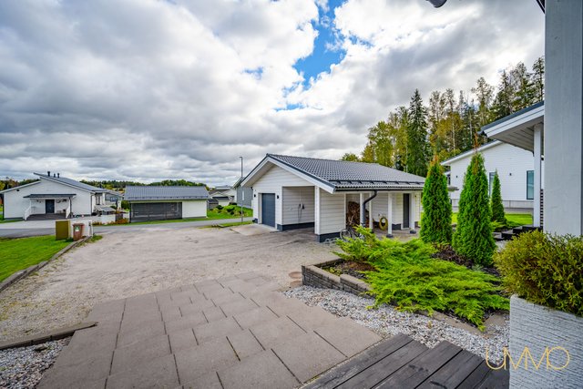 Pihalta löytyy erillinen, yli 30 m² lämmin autotalli ja varasto sekä autokatos. Takapiha rajoittuu metsään, mikä tuo kivasti yksityisyyttä ja rauhaa arkeen.