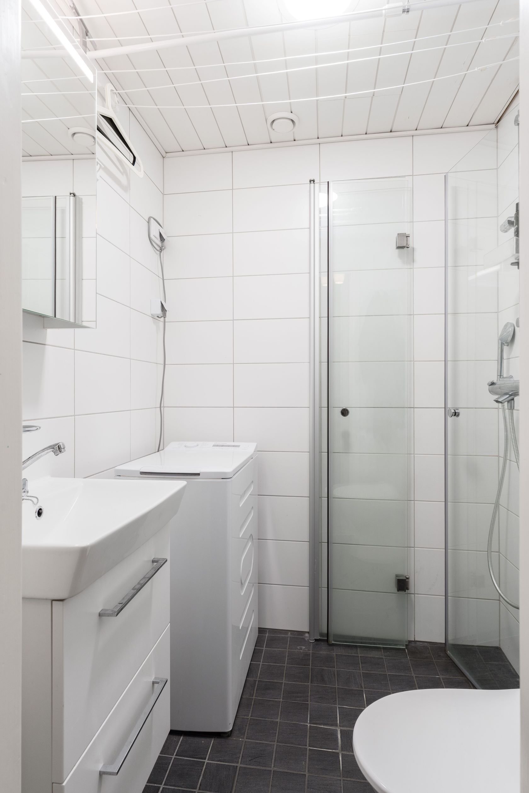 - WC-istuin, suihku, pesuallas, suihkuseinä, pesukoneliitäntä, peilikaappi, peili, ja allaskaappi
