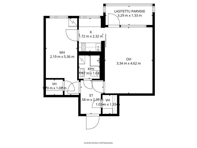 - Ei tarkistusmitattu. Pinta-alat saattavat tämän ikäisissä kohteissa (yhtiö rekisteröity ennen 01.01.1992) poiketa olennaisestikin asuinrakennusten nykyisten mittaustapojen ja standardien (SFS 5139) mukaan laskettavasta asuintilojen pinta-alasta. Pinta-ala voi siis olla edellä mainittua pienempi tai suurempi.