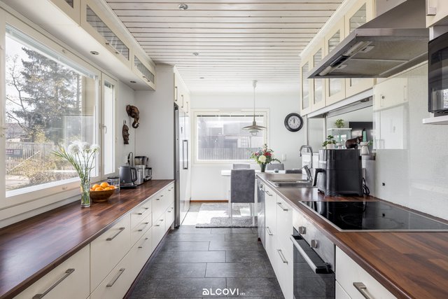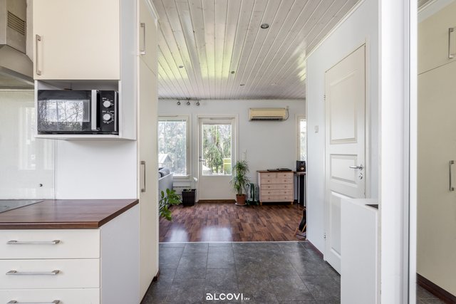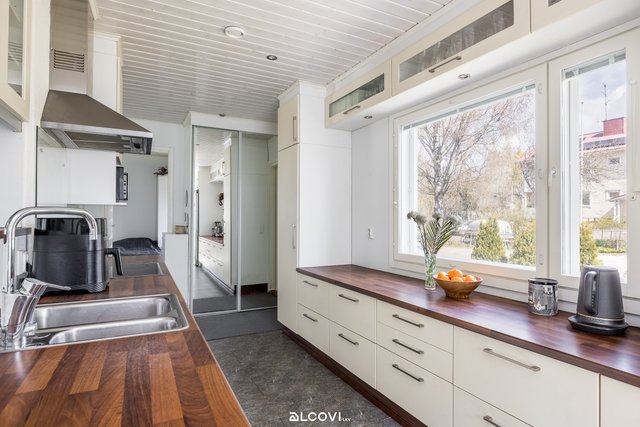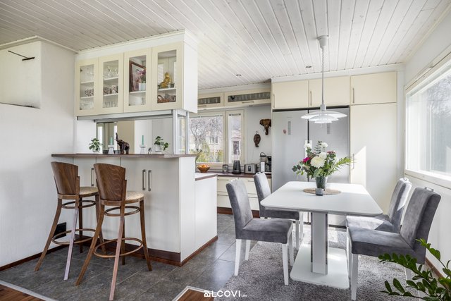 - Keittiön varustukseen kuuluu liesitaso, kalusteuuni, liesituuletin, astianpesukone, jääkaappi ja pakastin (uusittu 2023). Työtasot ovat laminaattia. Lattia on laattaa, seinät maalatut. Hyvin tilaa ruokailuun.
