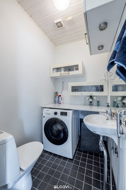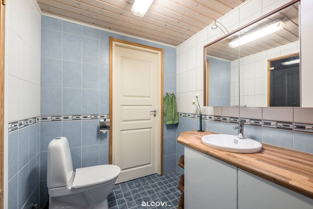 - Kylpyhuoneen varustukseen kuuluu wc-istuin, allas- ja peilikaappi, työtasoa, naulakot ja lattialämmitys (sähkö). Lattia on laattaa, seinät kaakelia ja katto paneloitu. Katossa upotetut spottivalot.
