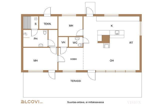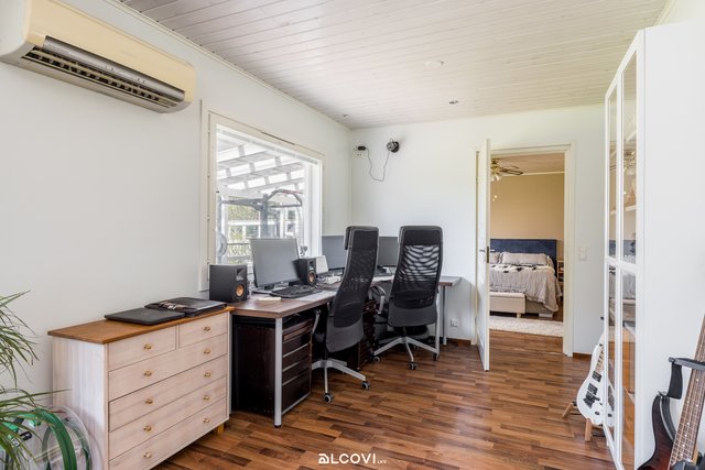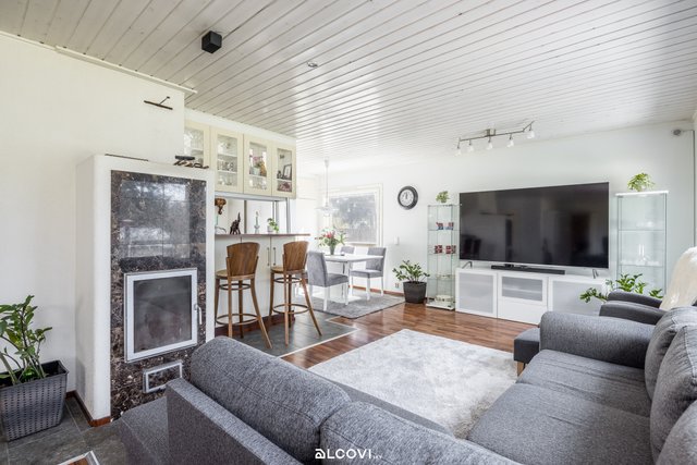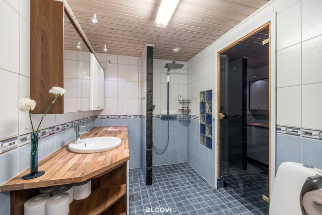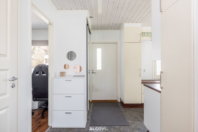 Runsaat työskentelytasot ja laadukkaat kodinkoneet takaavat keittiön käyttömukavuuden. Myös ruokailuun on luontainen paikkansa. Tilavaan olohuoneeseen on nykyisellään tehty työtila, joka on jaettavissa omaksi huoneekseen. Makuuhuoneita löytyy kaksi, joihin mahtuu juurikin kaikki tarpeellinen, lisäksi päämakuuhuoneesta on kulku suoraan suojaisalle terassille. Kylpyhuone saunoineen on siistikuntoinen ja toimiva kokonaisuus. Erillinen wc pyykinpesumahdollisuuksineen sijoittuu näppärästi eteisen yhteyteen. Säilytystiloja löytyy vaatehuoneesta, teknisestä tilasta/varastosta ja kylmästä ulkovarastosta.
