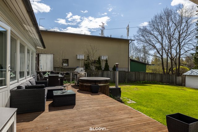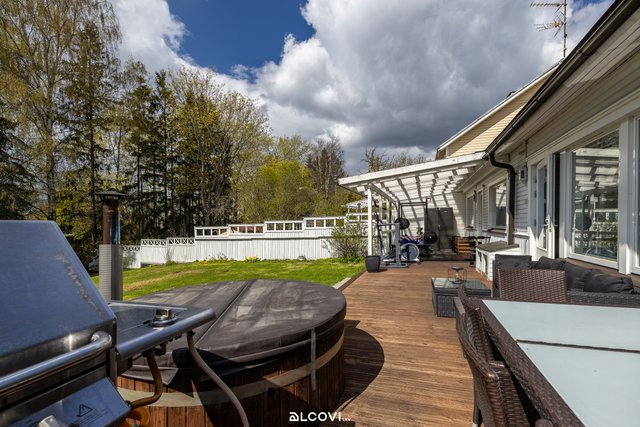 Pääosin aidattu piha-alue on nurmella helppohoitoiseksi viimeistelty. Päiväauringon suuntaan sijoittuva tilava terassi kutsuu rentoutumaan, ja palju on se kirsikka kakun päällä! Pysäköintiin löytyy paikkansa perheen molemmille autoille.