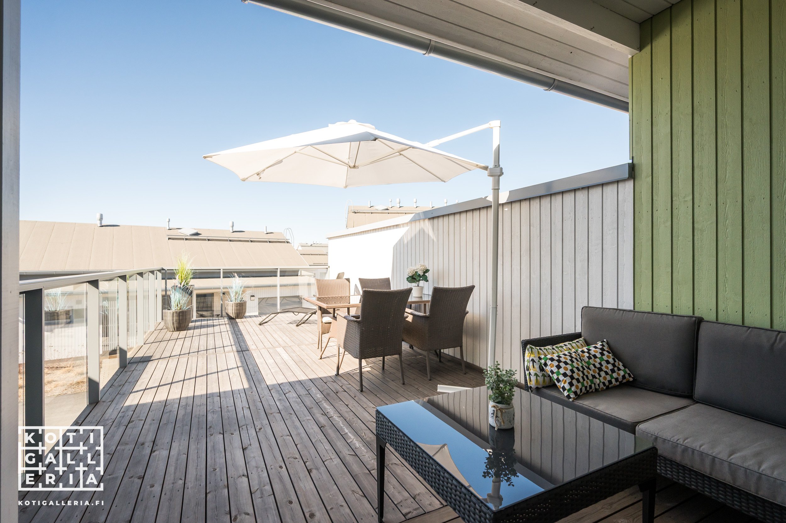 Talon kruunaa hulppea osittain katettu kattoterassi lasikaiteineen.