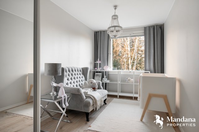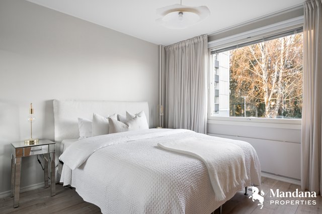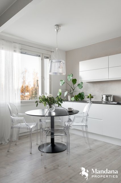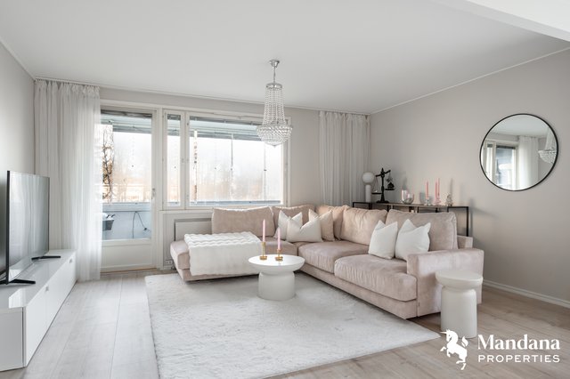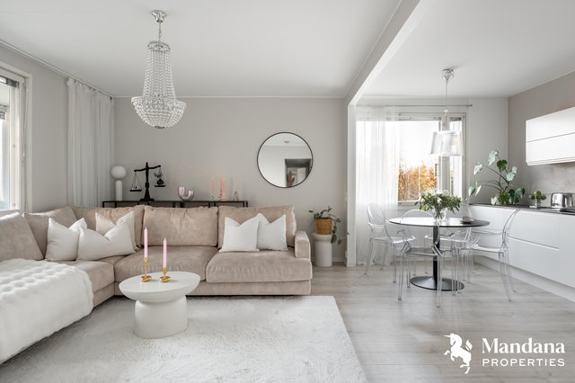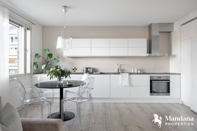 Tämä ensimmäisen kerroksen kulma-asunto (ei maantasalla, rappukäytävässä on hissi) hurmaa valoisuudellaan ja toimivalla pohjaratkaisulla. Kodin sydämenä on upea, nykyaikaisesti uudistettu keittiö, joka tarjoaa loistavat puitteet vaativammankin kotikokin makuun. Ikkunoista ja lasitetulta, länteen suuntautuvalta parvekkeelta aukeavat vehreät näkymät taloyhtiön piha-alueille.