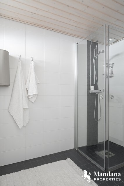 - VARUSTUS: Kääntyvät lasiset suihkuseinät, suihku, rättipatteri, pesukoneliitäntä, pesuallas, allaskaluste, peilikaappi, hana, bidee-suihku, wc-istuin. SEINÄT / LATTIA: Laatta.