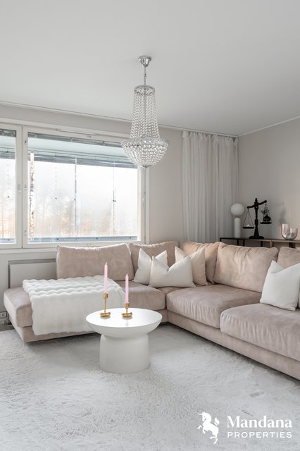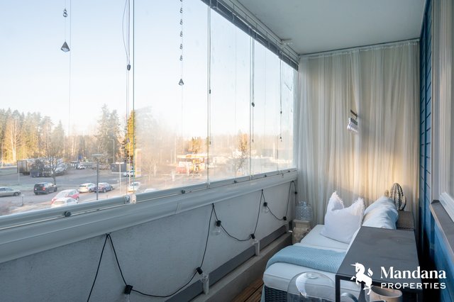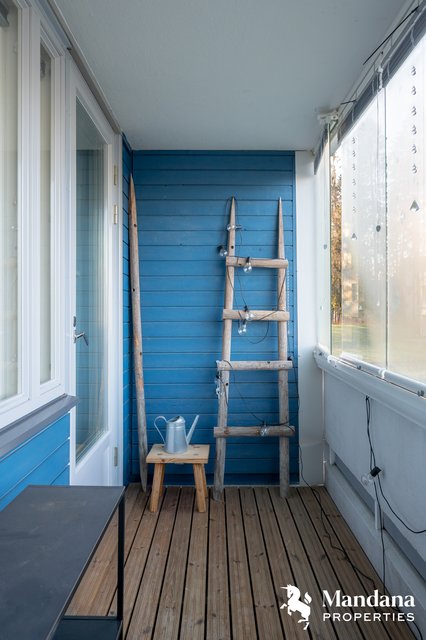 - Olohuone yhdistyy saumattomasti nykyaikaiseen avokeittiöön. Olohuoneesta kulku tilavalle lasitetulle parvekkeelle. VARUSTUS: Sälekaihtimet. SEINÄT: Maali. LATTIA: Laminaatti.