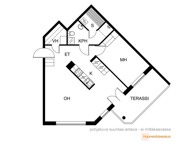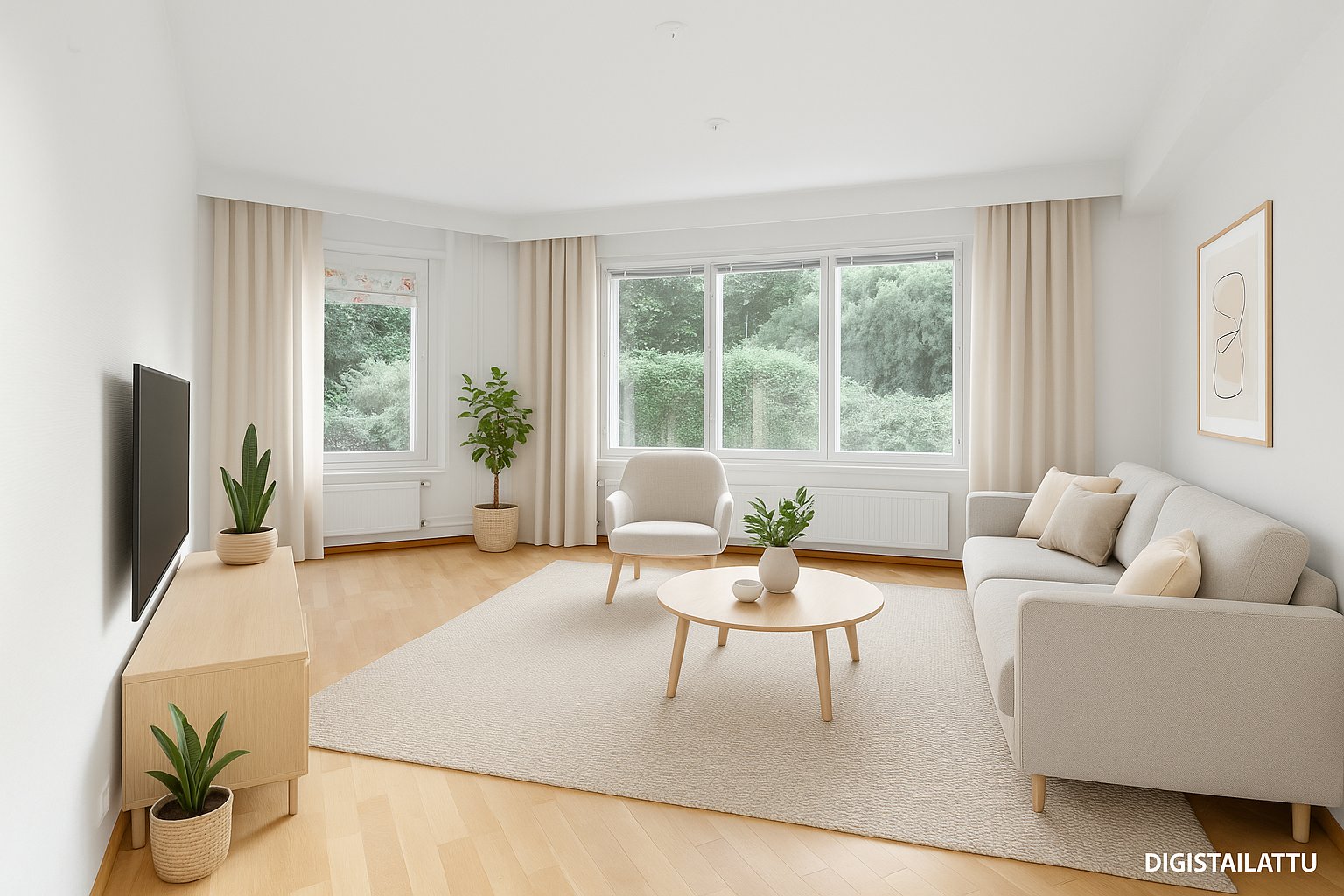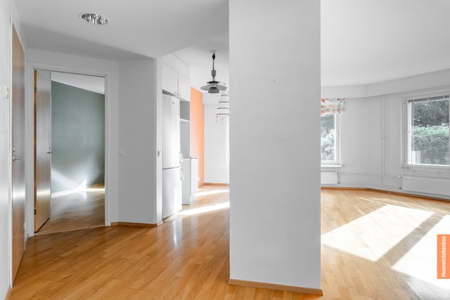Olohuone hurmaa valollaan ja avaruudellaan. Hieman epäsymmetrinen muoto tekee tilasta persoonallisen ja ainutlaatuisen – kodissa on sitä kuuluisaa "jotain erityistä". Olohuoneen yhteydessä oleva keittiö on toimiva ja kodikas, ja sen vieressä on oma paikka ruokapöydälle, joka toimii olohuoneen luonnollisena jatkeena.