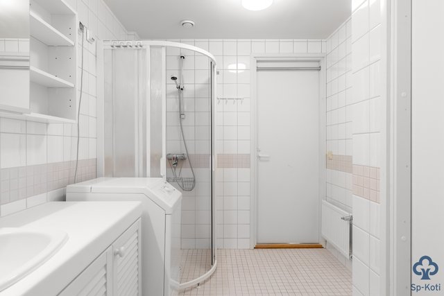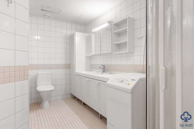 - Lattia ja seinät laatoitettu. Suihku, suihkukaappi, pyykinpesukoneliitäntä, pesuallas, peilikaappi, allaskaapisto, wc-istuin.