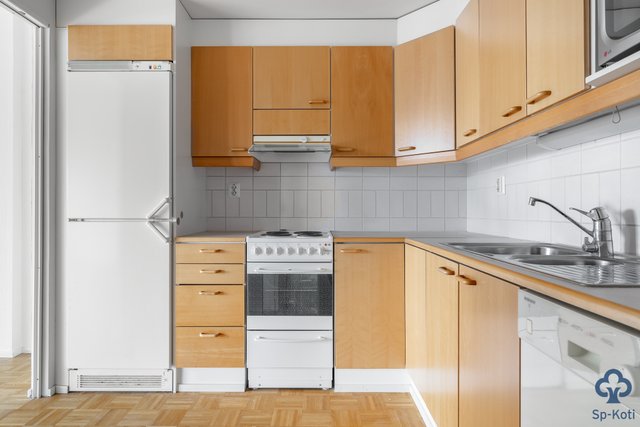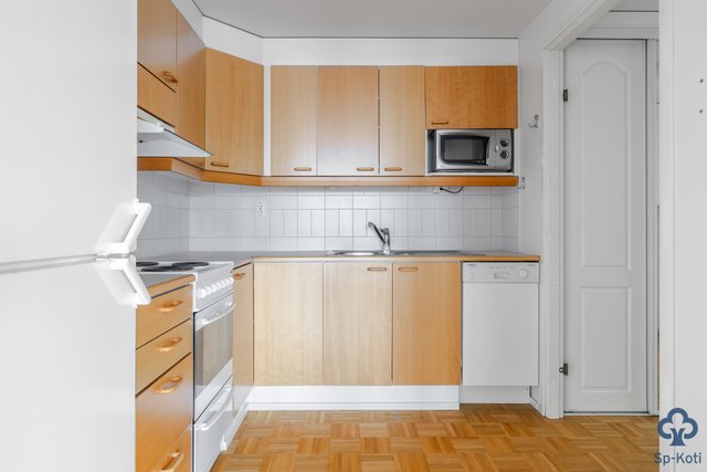 - Jääkaappipakastin, astianpesukone, mikrouuni, sähköhella. Mosaiikkiparkettilattia.
