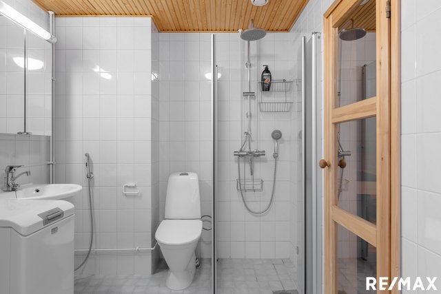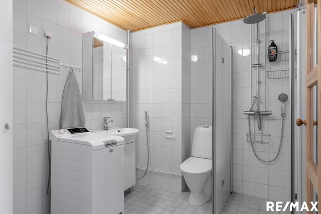 - Suihku, wc-istuin, suihkuseinä, pesukoneliitäntä, peilikaappi, pesuallas, allaskaappi, ja bidee-suihku