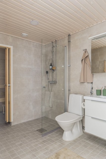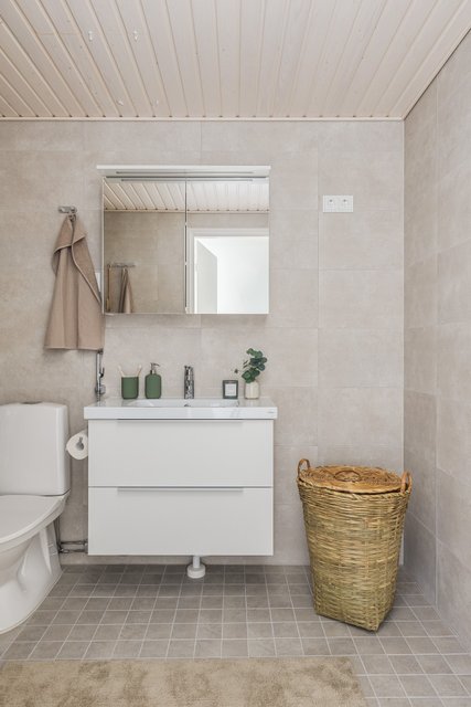 - WC-istuin, suihku, suihkuseinä, pesukoneliitäntä, allaskaappi, pesuallas, peilikaappi, bidee-suihku, ja lattialämmitys