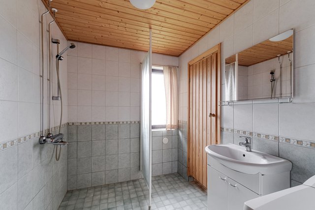 - Suihku, pesukoneliitäntä, suihkuseinä, allaskaappi, ja pesuallas