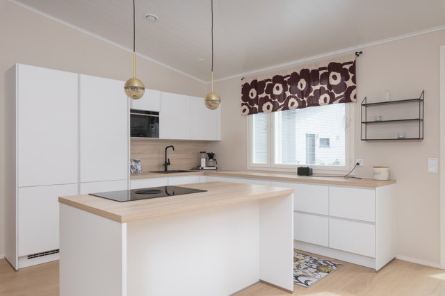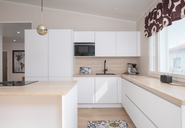 - Varustus: Induktioliesi, Liesituuletin, Uuni, Hana, Kaapisto, Allas, Astianpesukone, Jääkaappi, Pakastin, Integroitu mikroaaltouuni Seinämateriaali: Maali Lattiamateriaali: Laminaatti