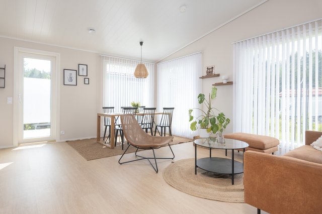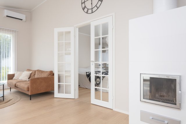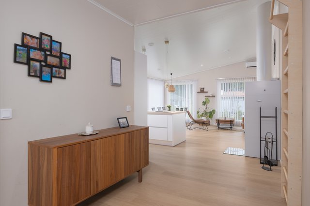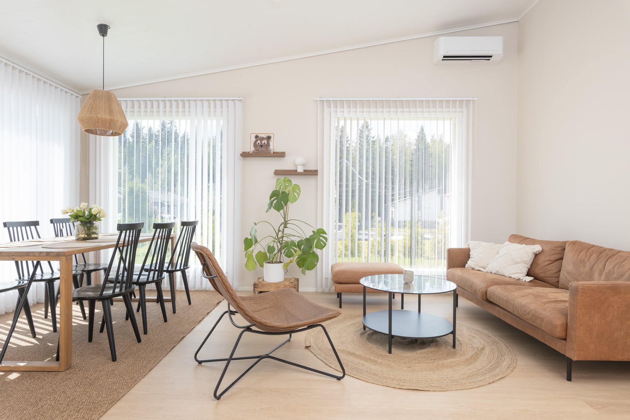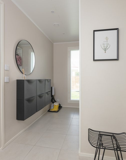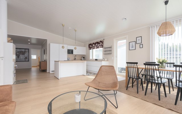 Kodin sydämen muodostaa olohuoneen ja keittiön yhdistelmä, josta on kulku terassille. Olohuoneessa on varaava takka, ja sen viereinen huone sopii hyvin makuuhuoneeksi tai työtilaksi. Keittiössä on saareke sekä runsaasti työskentely- ja säilytystilaa.