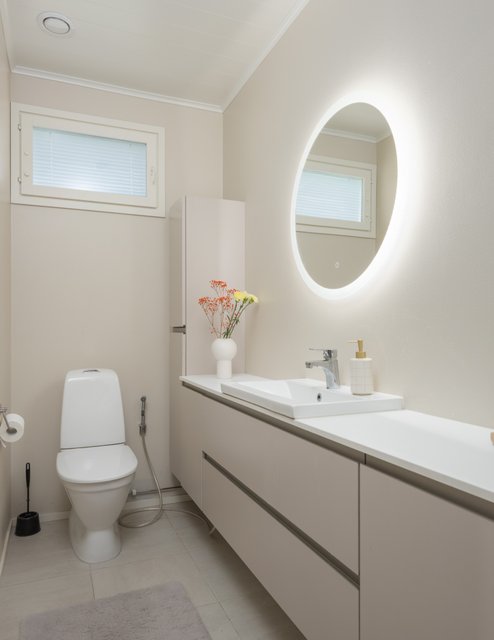 Talossa on neljä makuuhuonetta. Kaksi kylpyhuonetta, joista toisessa on sauna, tuovat arkeen joustoa. Lisäksi erillinen wc lisää toimivuutta. Kodinhoitohuoneesta on oma uloskäynti.